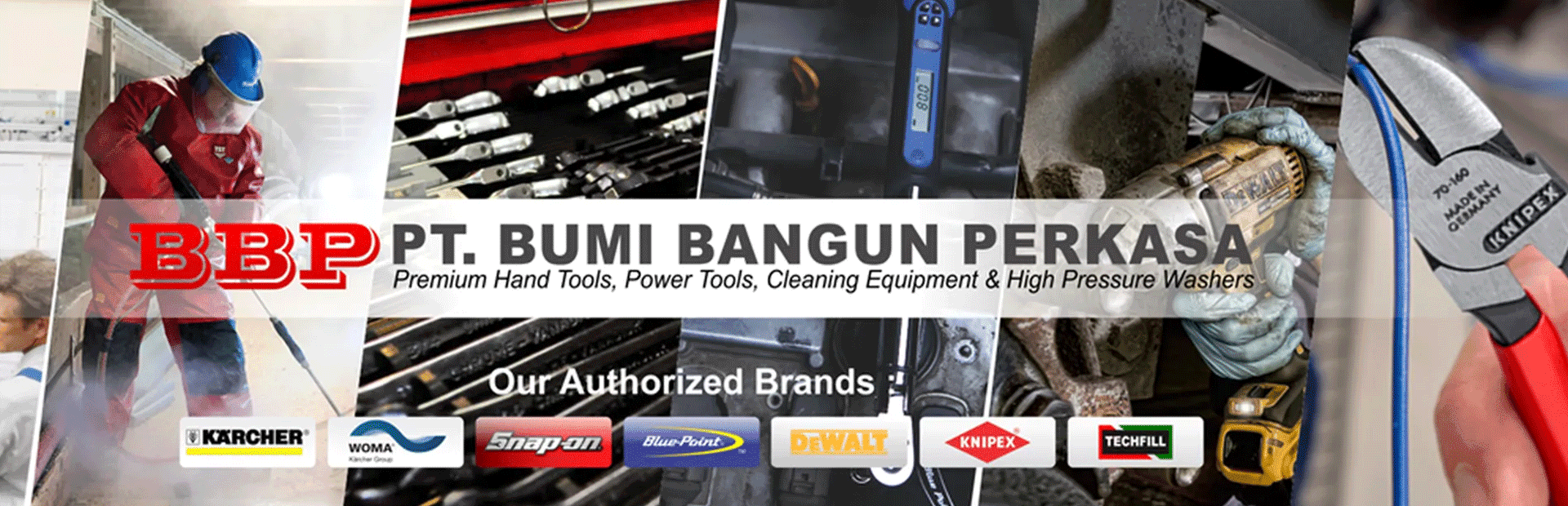 PT. Bumi Bangun Perkasa merupakan Authorized Agen Snap On Tools, Blue Point Alat dan Cleco yang telah beroperasi sejak tahun 2006 untuk mendistribusikan Premium Hand Tools dan Power Tools di seluruh Indonesia. Premium Hand Tools dan Power Tools dapat diterapkan / digunakan di berbagai bidang termasuk: